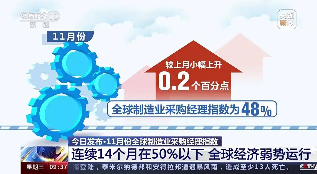 11月份全球制造业采购经理指数为48%,较上月小幅上升0.2个百分点,连续14个月运行在50%以下。