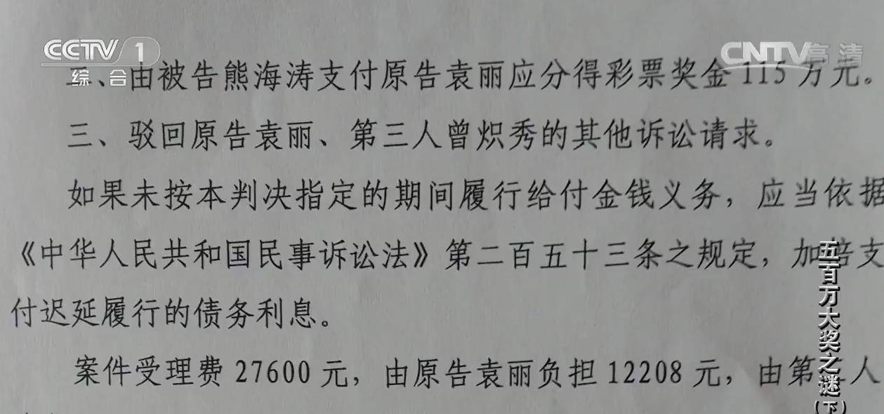 熊海涛不愿意分钱,2015年4月,袁丽一怒之下将他告上了法庭,要求对方分自己一半奖金。搜集证据的过程中,她发现前夫离婚后的第二天到重庆兑了奖,税后460万元。在兑奖中心,他承认彩票是自己买的,该单位的宣传人员还为他写了一篇报道。