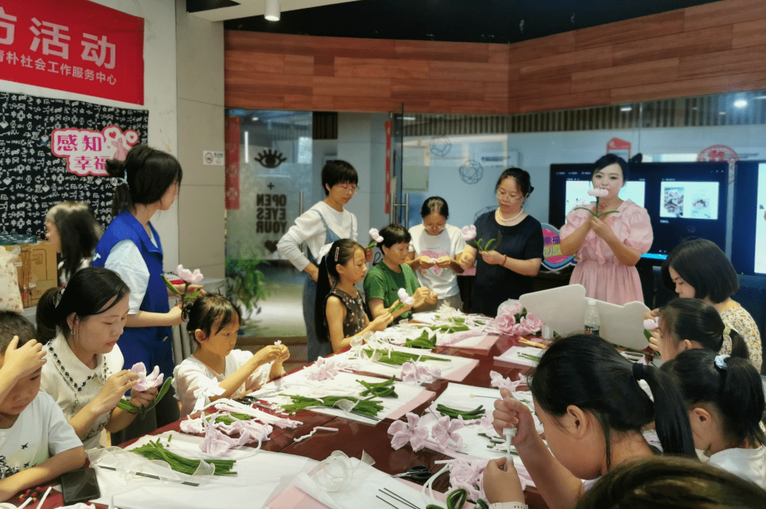 八宝街社区新时代文明实践站在社区童趣堂展开了美好八宝手艺坊活动——情满七夕扭扭棒花束制造。