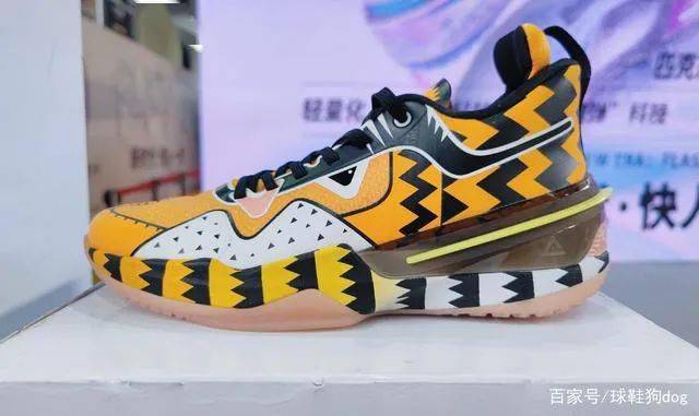 首先是狗哥最喜欢的“虎年”配色,细节非常多,配色很亮眼,这种简笔画的风格狗哥十分喜爱。能够正常的看到,鞋子用了橙色、白色和黑色三种颜色进行搭配,鞋面上用线条勾勒出“虎头”的画面,还有老虎的鬃毛,惟妙惟肖,二次元的画风非常讨喜,多种材料的运用也让鞋面的层次感提高了一个档次。中底侧面用了比较规则的图案,还是渐变效果的,给人一种速度感。鞋头位置的匹克logo也是有细节的,很漂亮。鞋子颜色的搭配很亮眼,而且把老虎的感觉反映出来了,叫他“虎头鞋”应该也能的吧?能把“生肖年”玩得这么好,真的该给匹克一个赞,这也是中国风的一种新展现形式,配色师加鸡腿!(球鞋狗dog)
