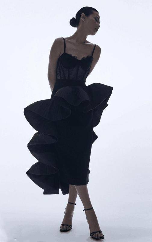 从背面看则愈加性感。背部全体都选用了蕾丝的资料,可是把透视的部分放弃了,仅仅挑选用蕾丝作为整个上半部。一方面正面有透视,不和没有,有主次之分,衣服才会愈加美观;另一方面蕾丝部分刚好形成了一个过渡,从完美的背部,过渡到遮遮掩掩的蕾丝,再过渡到实打实的黑色布料的裙体,整个规划十分高雅奇妙。